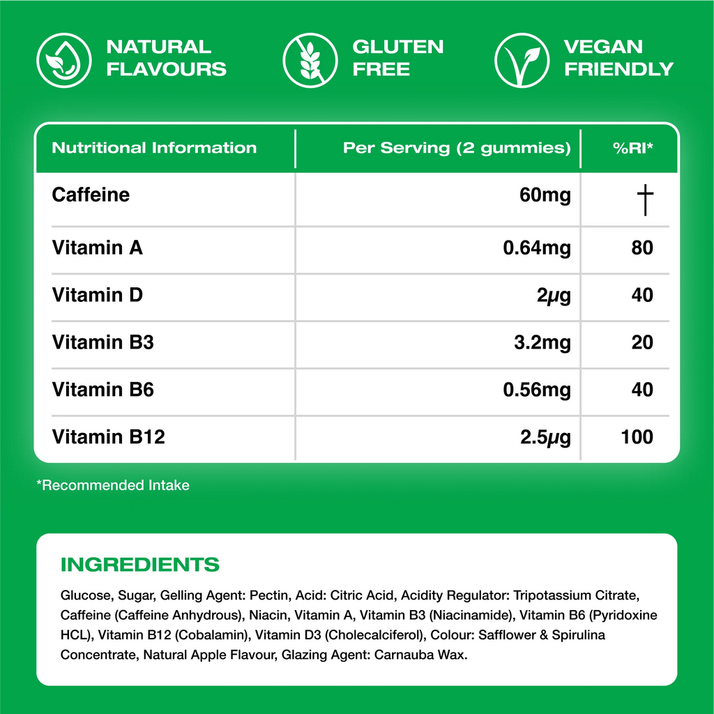 Precise, portable and effective, our gummies work quick! Formulated with 40mg of caffeine, B-vitamins & vitamins A&D, chewing one gummy is faster acting than any drink.