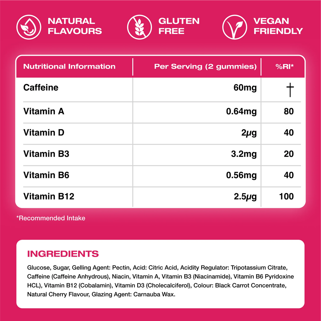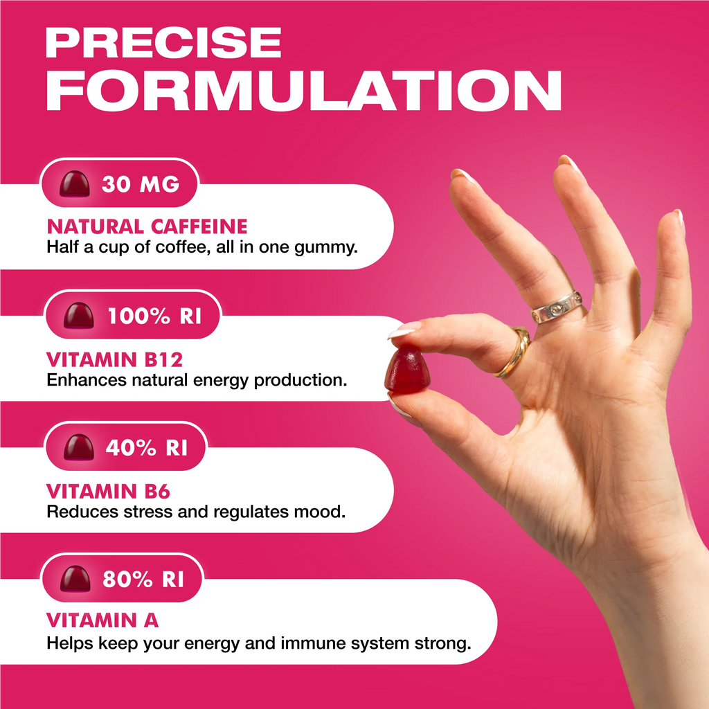 Precise, portable and effective, our gummies work quick! Formulated with 40mg of caffeine, B-vitamins & vitamins A&D, chewing one gummy is faster acting than any drink.